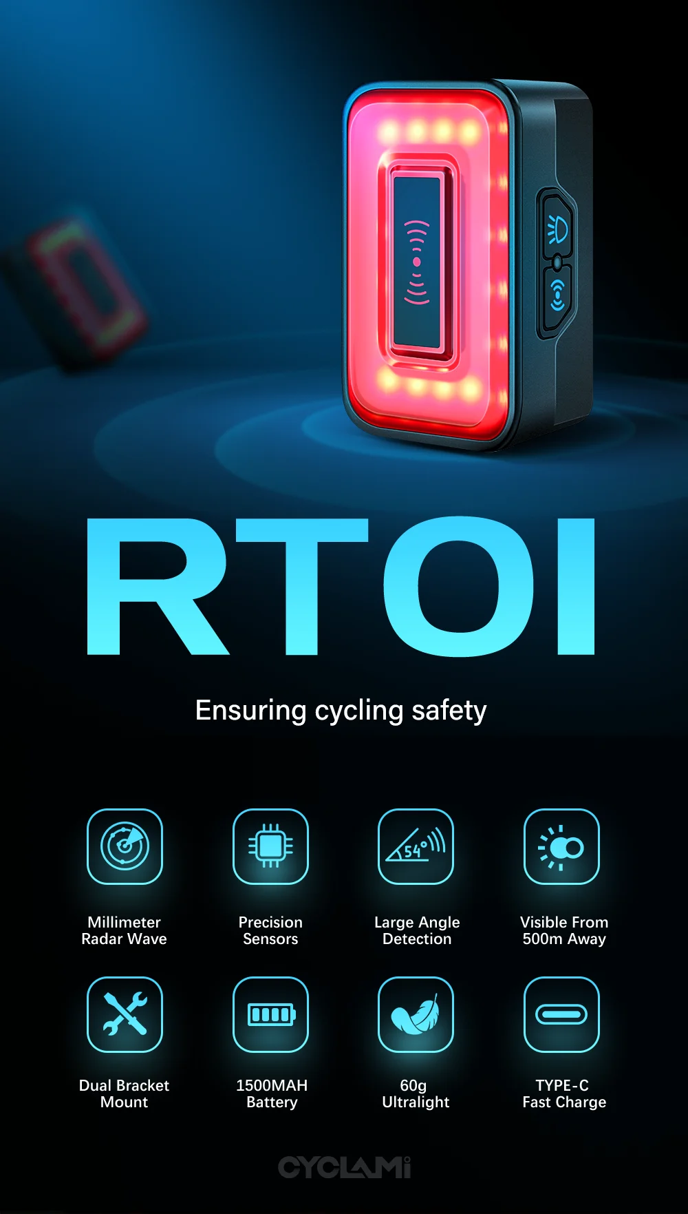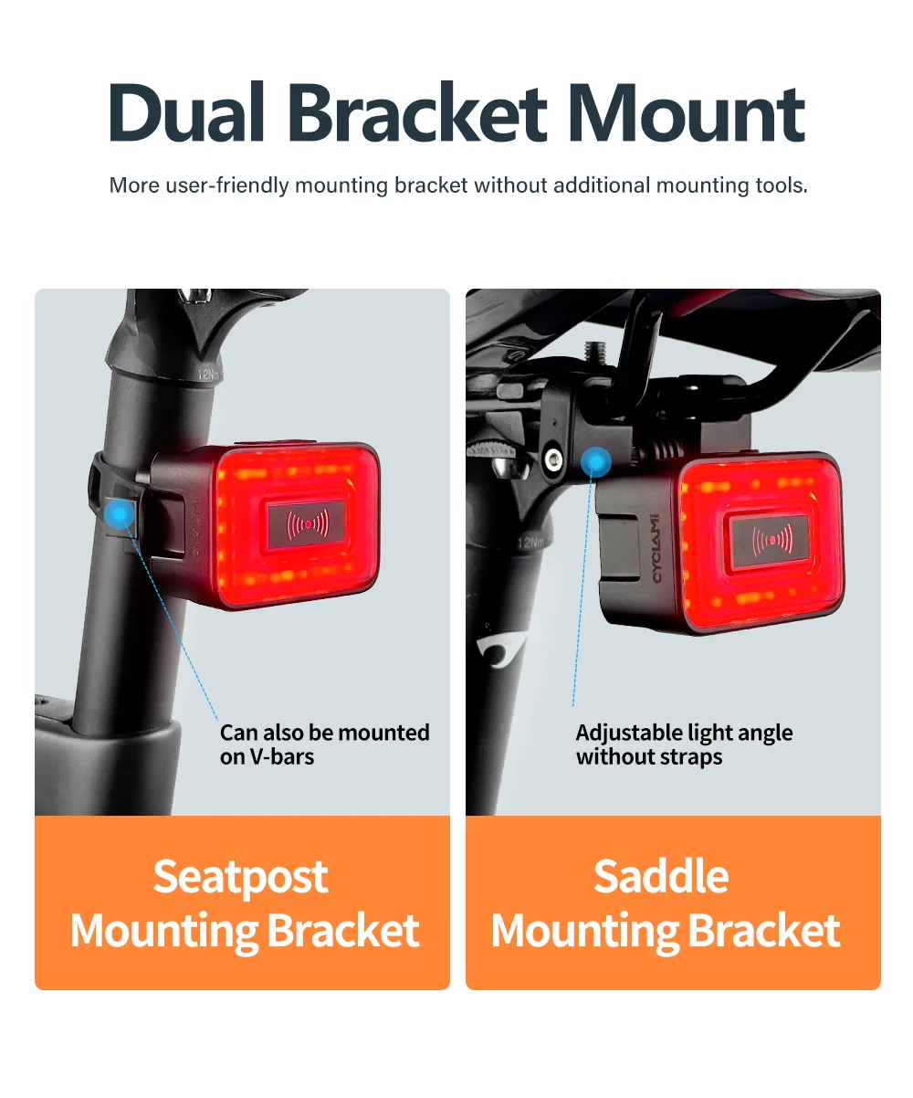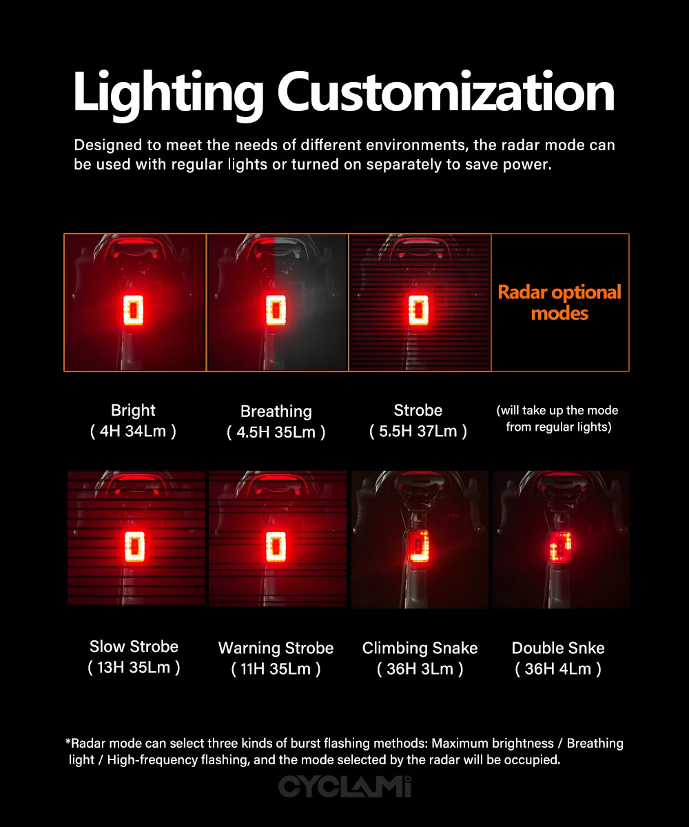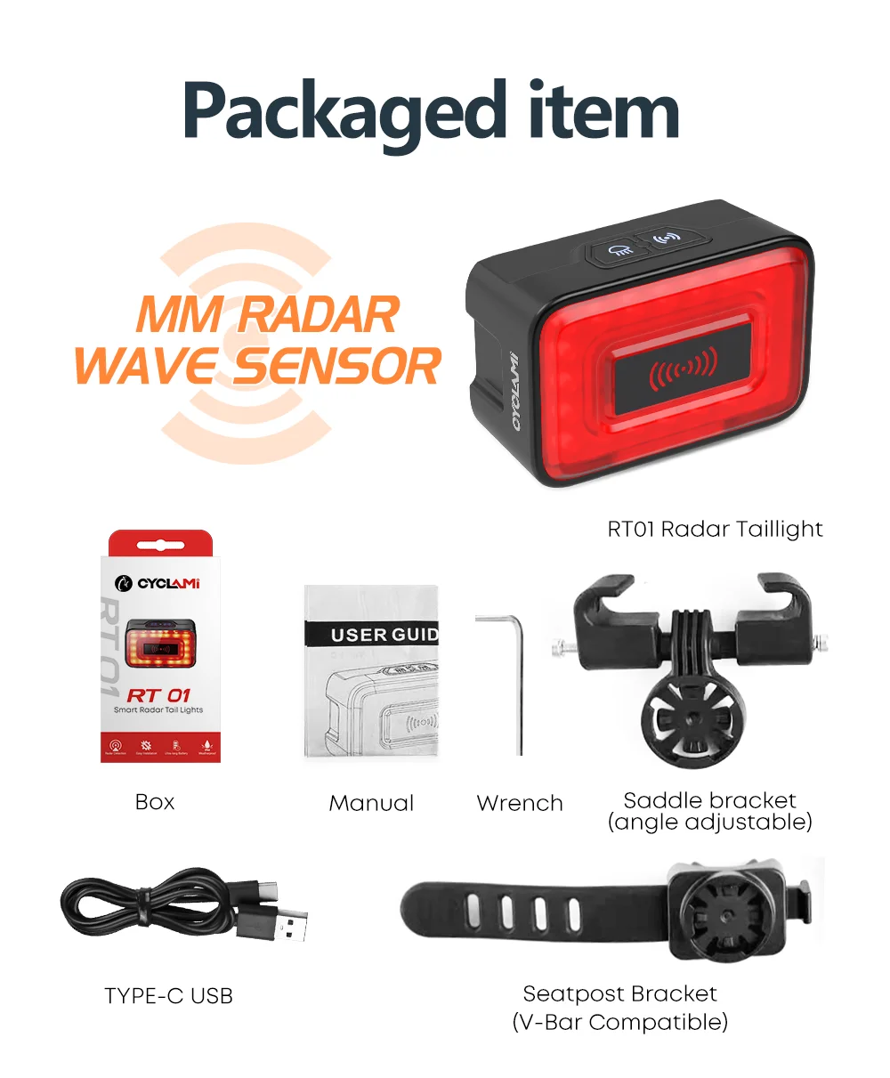 CYCLAMi Bicycle Radar Taillight Intelligent Sensing Warning Safety Light High Sensitivity and Brightness Red Light 24GHz IPX6