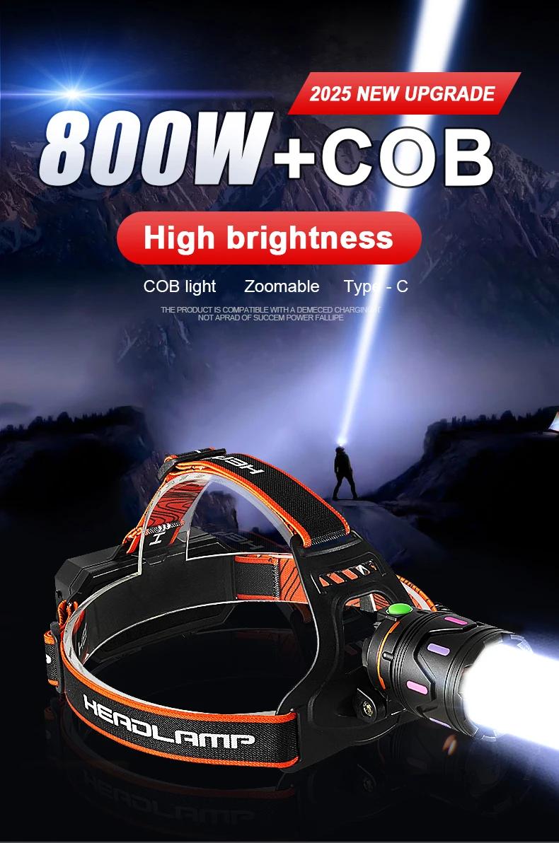 800W white laser wick with warning light rechargeable battery long life durable headlight suitable for fishing night riding outdoor workers